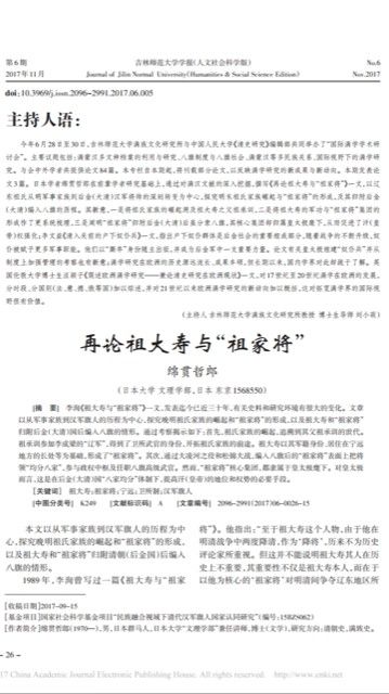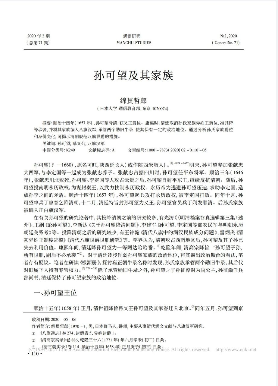 論文を上梓しました。「孫可望及其家族」(『満語研究』2020年2期、2020年12月、110-114頁)[中国語]